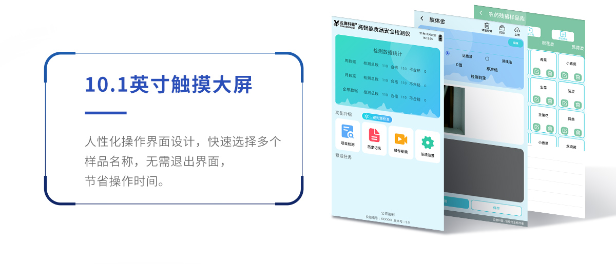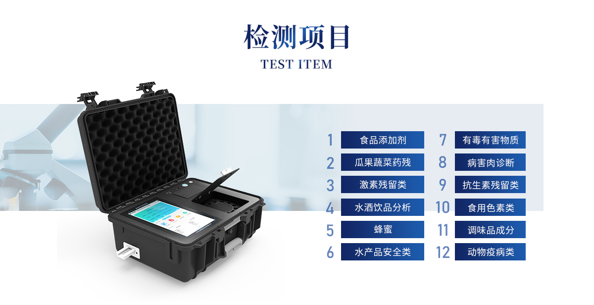 山東云唐智能科技有限公司生產(chǎn)的高智能食品安全檢測儀可快速檢測200多種食品安全項目,包含非食用化學(xué)物質(zhì)、濫用食品添加劑、農(nóng)藥殘留、獸藥殘留、重金屬、病害肉、營養(yǎng)強化劑、抗生素類殘留、激素類殘留、真菌毒素類殘留、化學(xué)類殘留等項目的定性定量檢測。